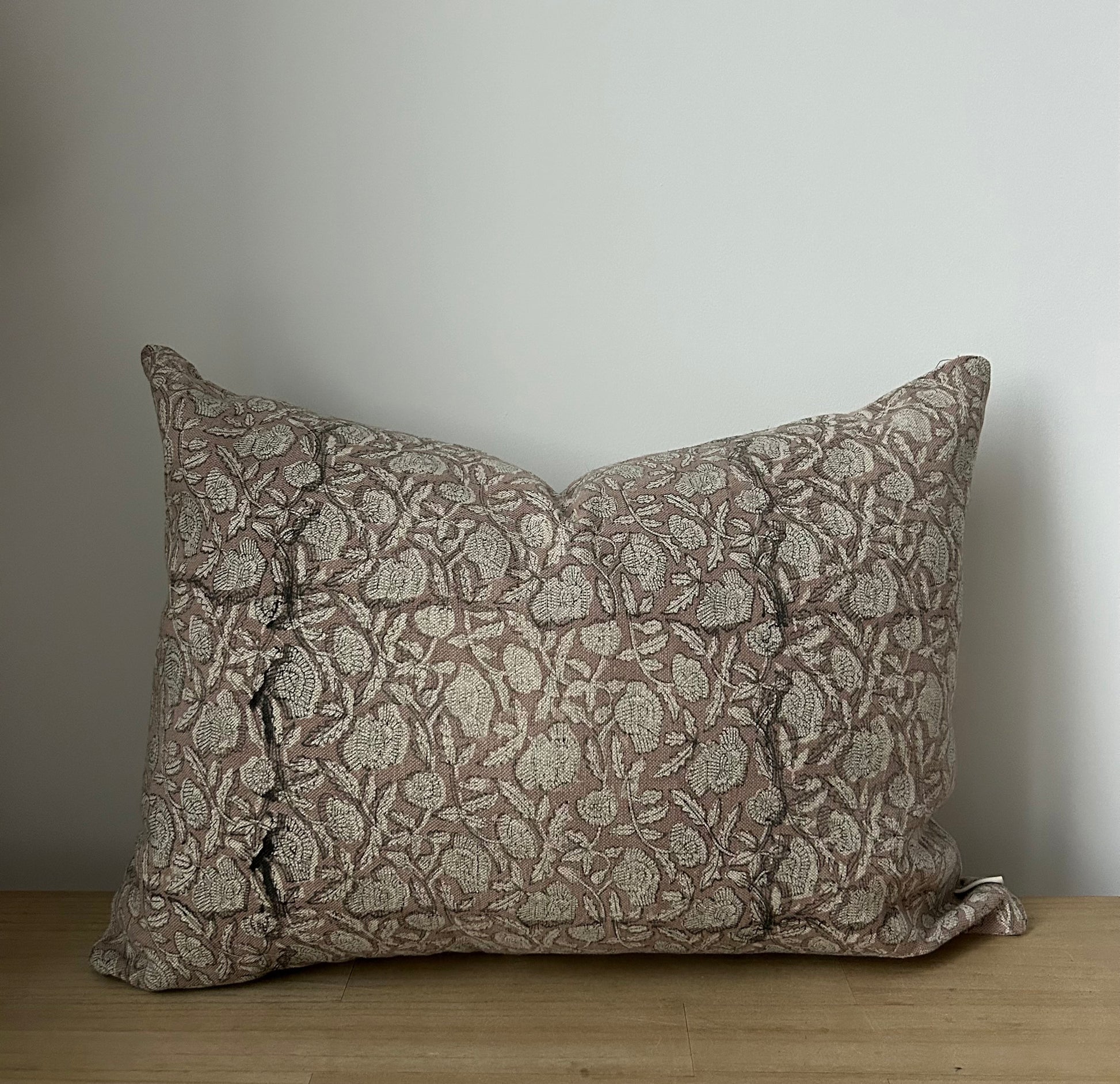 The Hellebore Linen Pillow boasts a hand-blocked print on a linen-cotton blend, featuring a delicate floral pattern in an elegant dusty pink and natural linen palette